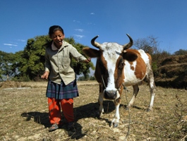 ブンガマティ村での治療を終えた後、往診のためドゥクチャップ村へ向かっていると、偶然、3年生のサシナと会った。牛の世話をしながら飼い葉を集めに来たのだという。毎日、2頭の牛の世話をすることがサシナの日課のようだ。