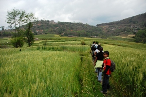 午後4時頃にヒマラヤ小学校を出発して、今回の登山口となるチベット仏教寺院が立ち並ぶ小さな町「ファルピン」へ向って、畦道をてくてくと歩いた。歌姫のラクシミが同行したお蔭で歌声が絶えず、とても賑やかな往路となった。途中、休憩した高台から眺めた一望千里の麦畑が本当に綺麗だった。見慣れた麦畑も場所を変えると、まったく違った景色に見えてくるから不思議だ。綺麗な景色を眺めていると、自然と人心地がついた。