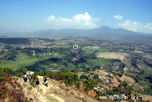 みんなでチャンパデビィにお参りした後、ヒマラヤ小学校が展望できる場所で休憩。真っ赤に咲き誇る石楠花の傍で、ヒマラヤ小学校を眺めながら子ども達と一緒に掛け合い歌(ドホリ)を歌い、楽しい時間を過ごす事が出来た。*写真:帰り道の八ティバーンからヒマラヤ小学校を望む。写真をクリックしてください。