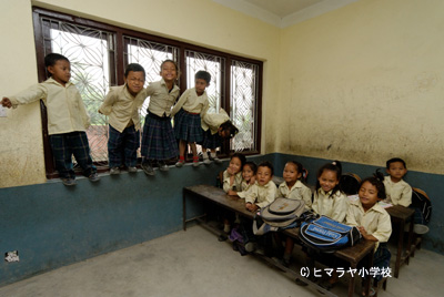 ヒマラヤ小学校の2、3年生が落ち着いて、しっかりして来たなぁと感心していたら、今度は幼稚園年長クラスの子ども達が手におえない程の元気さで、若い先生達を困らせている。ワンパク盛りの子ども達。暴れん坊ぶりは止まる所を知らない。幼稚園年長クラスでは、なぜか窓に登る事が流行っているようで、カメラを向けると必ず数名が窓に登ってポーズを決めている。もちろん先生に見つかったら叱られるので、先生が来るとすぐさま飛び降りて知らん顔。時々、逃げ遅れて叱られる子もいるが、叱られるなんて何のその。先生がいなくなると再び窓に登って、元気に雄叫び声を上げている。若い先生達にとっては大変な時期かもしれないが、来年、再来年になれば少しは落ち着くだろうと期待しつつ、若い先生を宥めている。