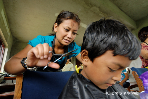 今日はヤラ・パタン婦人部の支援から、「美容・理容」の職業訓練を受けている4名の若い女性が参加して、子ども達の髪を切ってくれた。訓練生にとっては貴重な実践の機会であり、またヒマラヤ小学校にとっては、無償で子ども達の散髪をして貰える貴重な機会だ。お互いに利点のある良い連携なので、ぜひ、今後も続けていけたらと思う。
