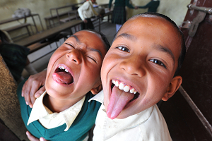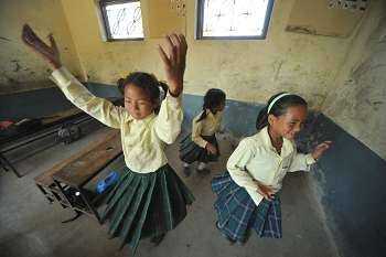 ヒマラヤ小学校で子ども達の様子を見ていると、ちょっとした言動が面白くて飽きる事はない。最近、ヒマラヤ小学校の低学年の子ども達の間では、どうもくるくる廻る遊びが流行っているようだ。誰が始めたのかしらないが、休み時間など教室の中でくるくる廻り、目を回わしてへたり込んだり、まっすぐ歩けなくなったりすることを楽しんでいるようだ。大丈夫かなぁと少々心配しながらも、実は見ている僕も結構楽しんでいたのだが、しかし、見て笑っているだけで許して貰えるはずなどない。先日、ついに子ども達から“あんたもやれ”コールが起こり、僕もくるくる回される事になった。こんなの何十年振りだろう。