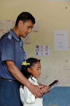 教壇に立つ一人の教師としてヤッギャ校長を見ると、子ども達に対する無償の愛を感じることが出来る。数年前、アメリカの小学校を訪ねた時、地元で有名な女性校長が、「悪さをした子は、まず抱きしめてあげるのだ」と話していたのが印象深かったが、ヤッギャ校長も授業中など、必ずといっていいほど子ども達の体に触れている。ヤッギャ校長の大きな手から伝わってくる優しさを受けながら、子ども達は成長しているのだろう。