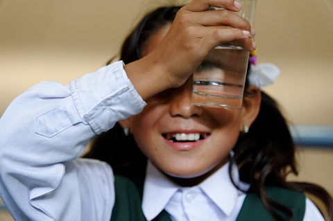 水の入った透明のコップから見た不思議の世界に、3年生のプスパが歓声を上げた。