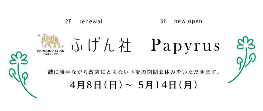 既報のとおりコミュニケーションギャラリーふげん社は現在、リニューアル工事中。5月15日にリニューアルオープンし、ギャラリーと書店がパワーアップし、更に3階にはデジタルラボ「Papyrus(パピルス)」が開設される予定です。