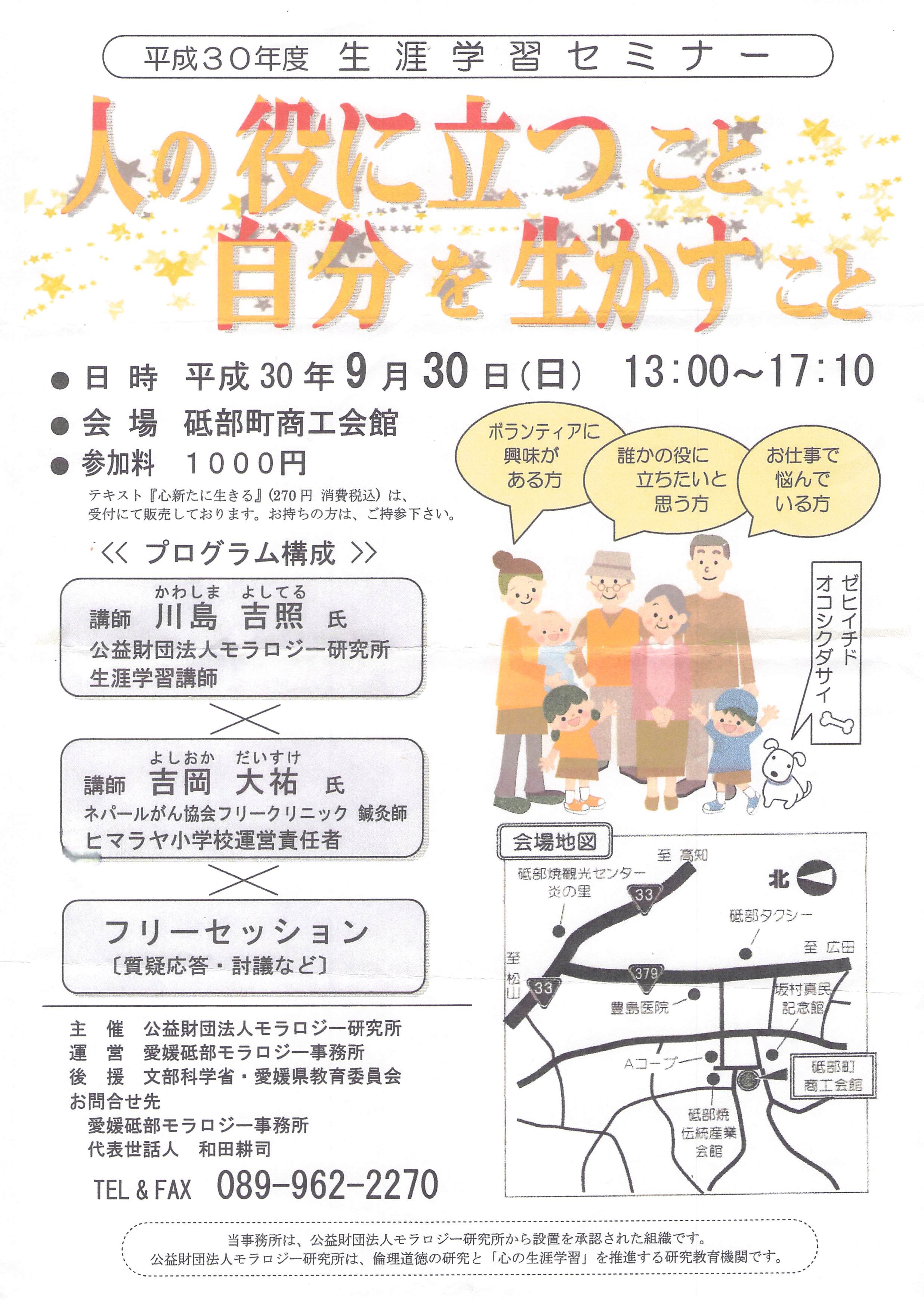 明日、30日に予定されていたモラロジー研究所主催の生涯学習セミナーは台風のため中止となりました。代替プログラム開催の有無につきましては決まり次第、ご報告いたします。