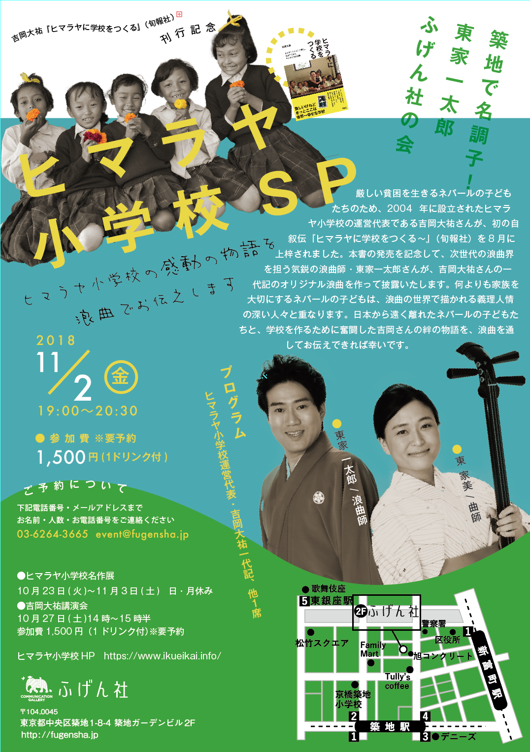 この度、コミュニケーションギャラリーふげん社で「ヒマラヤ小学校名作展2018〜ひとりひとり〜」を開催頂くことになりました。会期中はぼくの講演会(10月27日(土))や浪曲師・東家一太郎さんによるヒマラヤ小学校スペシャル浪曲の披露(11月3日(土))も予定されています。ぜひ、皆さま遊びにお越しください。くわしくはこちらから。