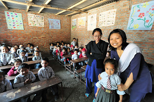 ネパールを訪問中の支援者の方と共にヒマラヤ青少年育英会の里親教育基金の元奨学生(現在も大学就学費用の一部、支援を行っている)で、現在はパタン市内の私立学校で教師として活躍しているアシュミタの授業参観を行った。アシュミタはこのブログでも何度か紹介している通り、僕達が活動を始めてから最初に支援を行った12人の奨学生の一人で、心臓病や貧困に負けることなく逞しく生きている女の子だ。アシュミタの底抜けに明るい笑顔には僕自身、ネパール生活の中で何度も救われてきた。アシュミタが教師になってから、一度、授業参観をしたいなぁと思いつつ、忙しさにかまけてしまいなかなか実現できないまま状況が続いていた。今日ようやく実現する運びとなり、朝からそわそわ落ち着かない状態だった。授業参観に同行された方は長年、教師として活躍された方で、アシュミタが教師を目指す切欠を与えてくださった恩人の方でもある。アシュミタにとっては今日は晴れ舞台でもあり、貴重な学びの時間だ。
