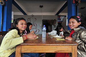 ゲストハウスに着いた後、みんなで揃って食堂で夕飯を食べた。ここの食堂、料理がなかなか美味しくて子ども達からも大好評だった。ナガルコットからバクタプールに変えた事で宿泊料金が安くなった分を料理に充てたので、肉料理もあり、料理がなくなるまでお代わり自由となった。子ども達には至福のひと時となったようだ。お腹一杯食べた後の子ども達の満足げな顔を見ていると、バクタプールを選んで良かったとつくづく思った。夕食の後は予定通り、歌えや、踊れやの大騒ぎ。ゲストハウスオーナーの全面的な協力も得て、夜遅くまで子ども達、先生達が一緒になって歌って踊っての楽しい時間となった。消灯後の騒ぎは皆さんの想像の通り。子ども達の元気さにつくづく驚かされた夜となった。